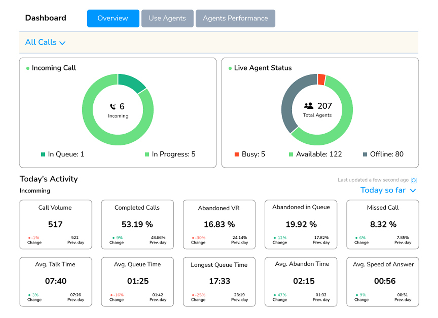 New: Designed a Live Agent Status ring and Today’s Activity grid. Each KPI (like "Abandoned in Queue") now features a color-coded "Change %" relative to the previous day, allowing managers to spot issues in seconds.