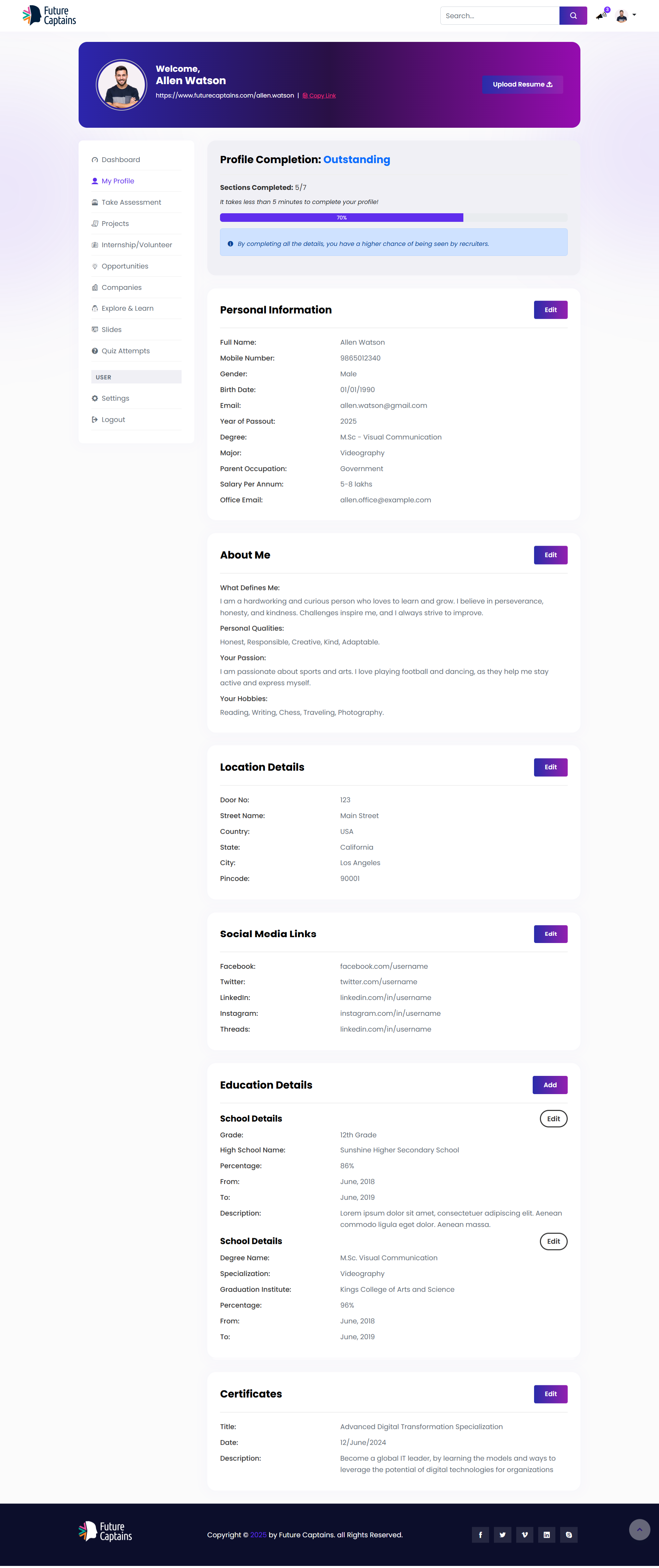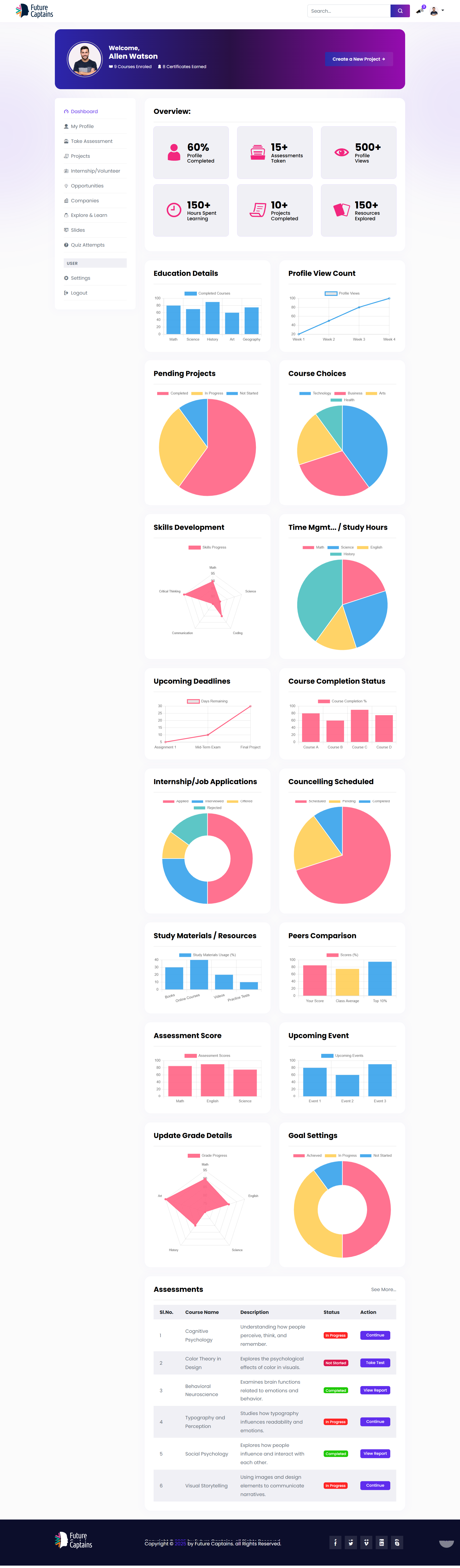 The original LRM dashboard was non-responsive, visually cluttered, and disconnected from FutureCaptains' branding. The layout made navigation difficult, features were scattered, and users spent too much time searching for essential actions. I led a complete redesign of the dashboard experience, starting with a UX evaluation. I reorganized the information architecture, improved the navigation hierarchy, and reduced unnecessary interaction steps to create a more intuitive flow. I designed the new dashboard in Figma, aligning every component with the updated brand guidelines and Bootstrap 5.x design principles. This included consistent colors, typography, spacing, and reusable UI elements. I added new user-centric features to improve productivity, clarity, and ease of use. For development, I built the frontend using HTML, CSS, and jQuery, ensuring full responsiveness and a seamless look that matches the main website. I also used ChatGPT to help design and develop complex dashboard components, enabling faster implementation while ensuring stability and usability. The final dashboard offers a streamlined, modern, and consistent experience that improves discoverability, reduces time spent navigating, and provides a more focused learning environment.