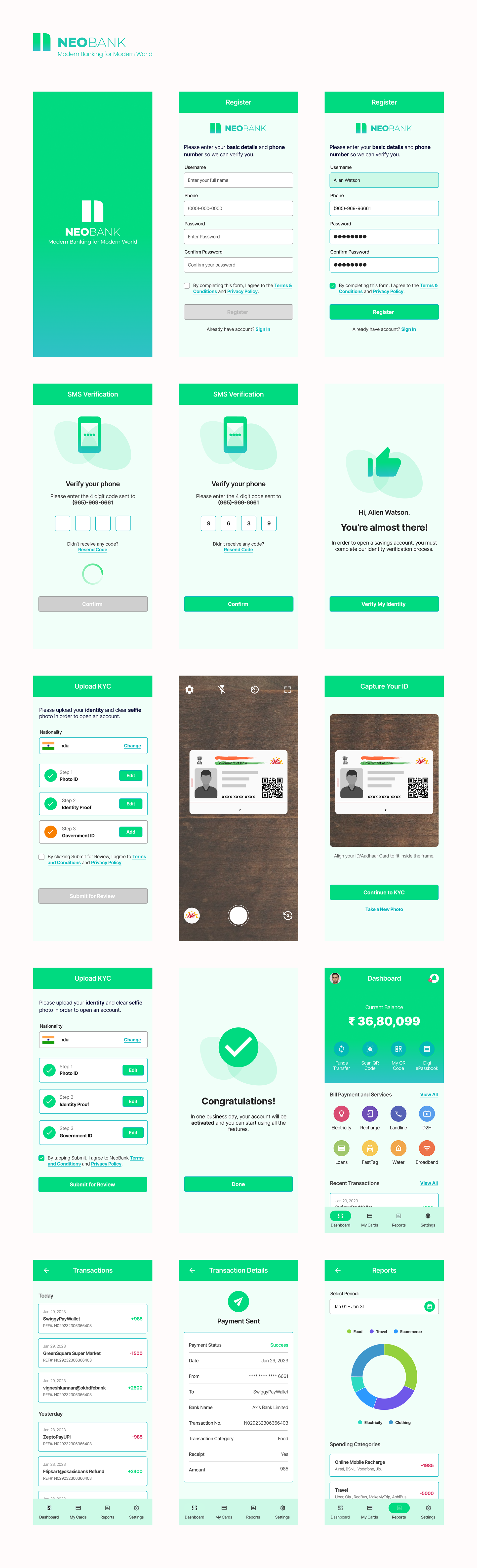 This is a conceptual Neo Banking app designed for my personal portfolio, inspired by leading UPI and payment platforms like GPay, Paytm, and other digital wallet solutions. The goal of this project was to explore a modern, secure, and fast digital payment experience that covers everyday UPI transactions, wallet balance, KYC onboarding, and user identity verification. I designed the entire experience as a hybrid mobile app, ensuring it can function seamlessly across both iOS and Android. The UI is built with flexibility in mind—especially when it comes to branding. For this concept, I chose a fluorescent green theme, inspired by The Matrix and the idea of “Neo” as a futuristic, digital identity. While this bold color would not usually be ideal for everyday usability, the app is designed with fully adjustable color variables inside Figma, allowing the theme to be adapted instantly to any brand palette or accessibility requirement. The design process focused on building intuitive flows for: UPI payments Money transfers Bank account linking KYC onboarding Transaction history QR payments Security & authentication steps I created a complete component library and design system in Figma, including scalable typography, responsive layouts, iconography, and a color-variable-driven theme. This allowed me to quickly test different color modes (green, blue, purple, neutral, etc.) while keeping the interface consistent and predictable. The result is a sleek, modern, and flexible Neo Banking concept app that showcases UX clarity, multi-platform design thinking, and a thoughtful approach to digital finance interactions.