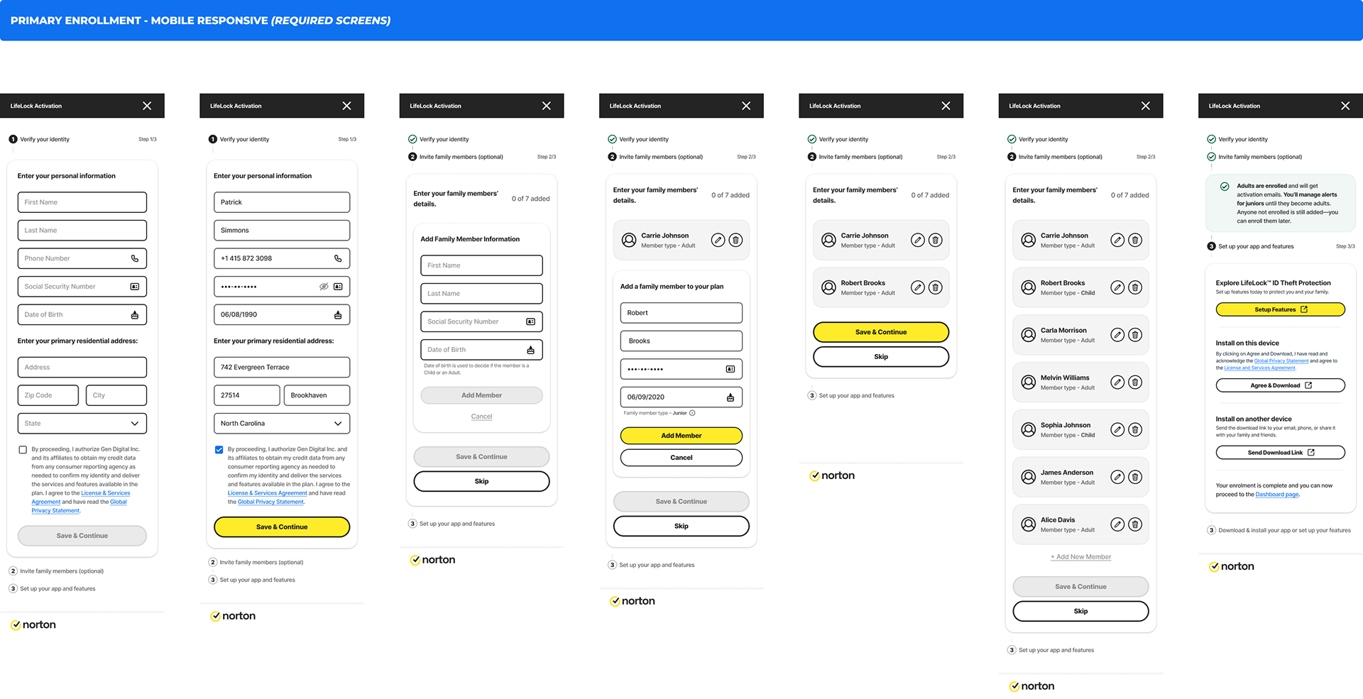 LifeLock is a high-value identity and credit-protection product within the Norton ecosystem. While the product itself delivers strong protection, its enrollment experience had become a major barrier to adoption. Users were dropping off at scale before activation, which directly impacted retention, upsell, and lifetime value.