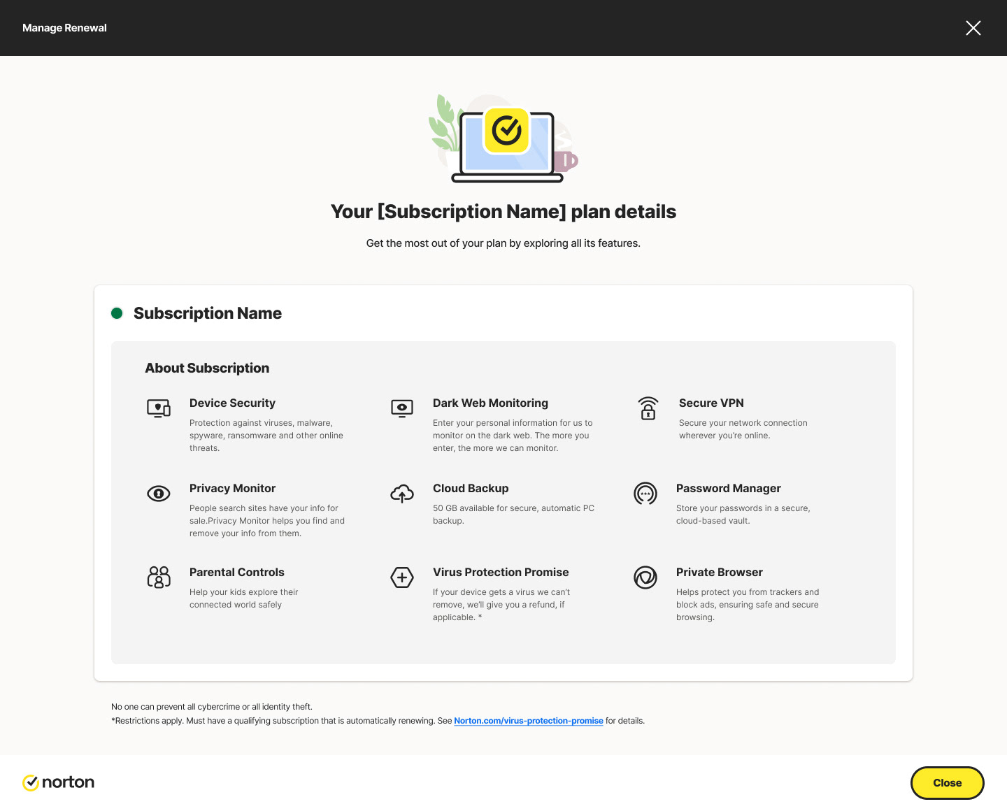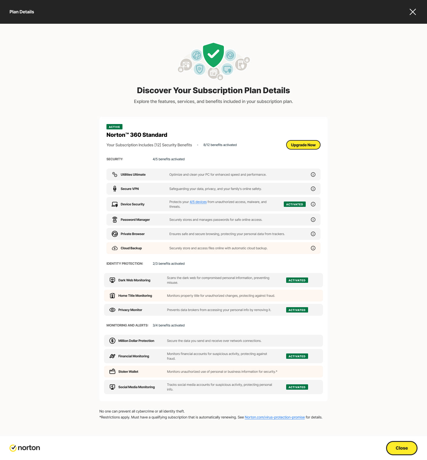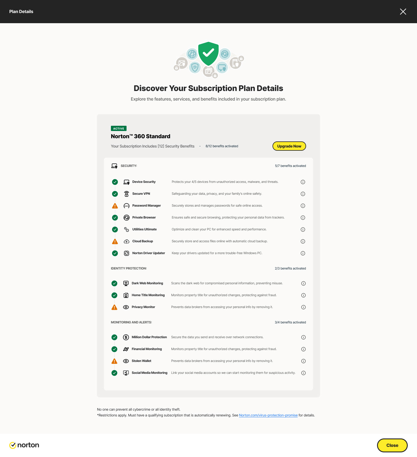 In this version of the My Subscriptions page, I streamlined the layout by reducing excess space and organizing the plan features into clear, nested categories. Instead of repeating activation statuses, I introduced visual indicators to make the page cleaner and more intuitive. I also surfaced the total number of benefits and highlighted how many were currently activated, giving users a quick understanding of their subscription value. Additionally, I added an upsell section with an “Upgrade Now” option to drive conversion opportunities. Overall, this iteration enhances clarity, usability, and feature discoverability.