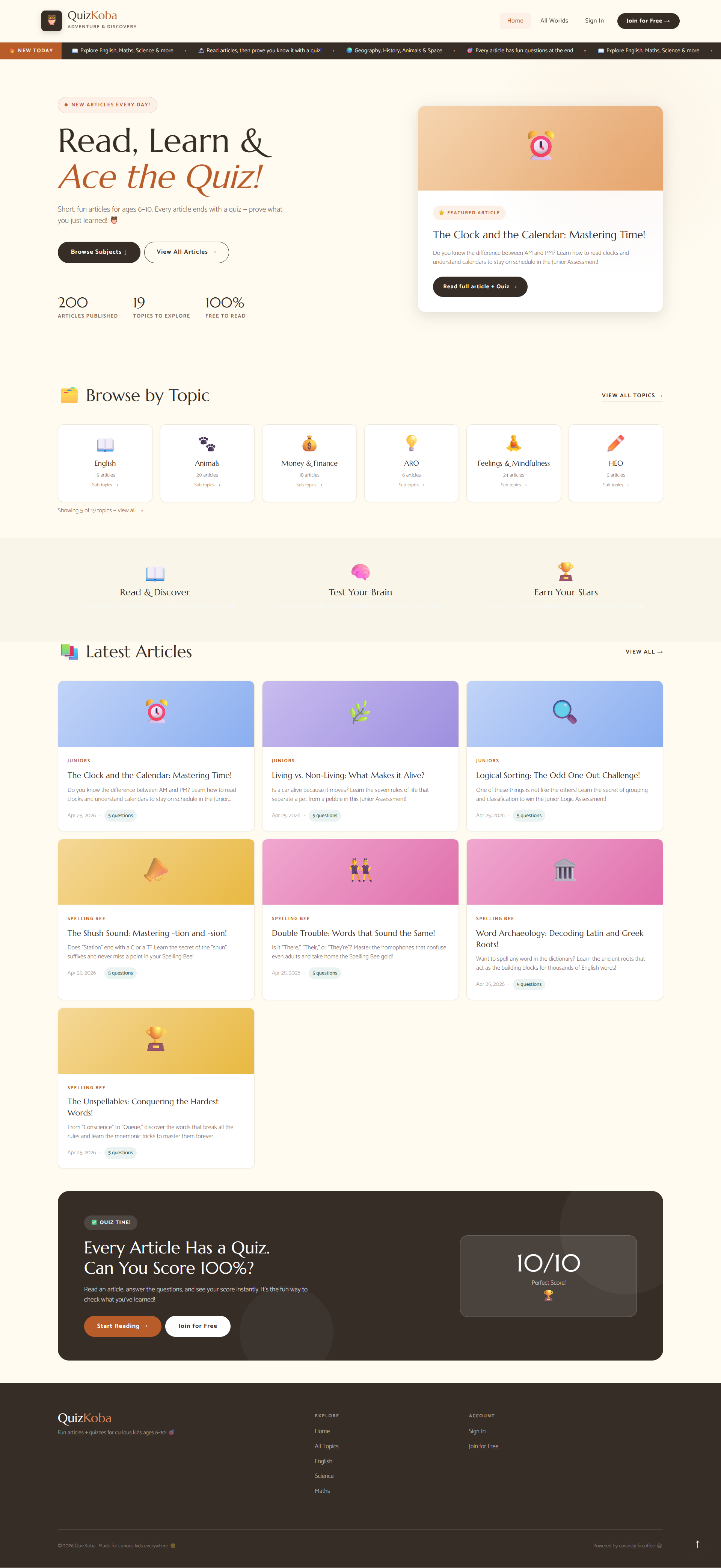 QuizKoba is my independent project, an interactive learning platform that I am architecting as a UI/UX and Product Designer. Originally focused on Grades 1–4, I am currently evolving the platform with a more modern, universal UI/UX designed for a general audience. To streamline the development, I leverage Claude for design prompting and frontend iteration, bridging my creative vision with my expertise in HTML, CSS, and JavaScript. The project is powered by a robust Supabase backend for database and authentication management, with the entire codebase versioned on GitHub and deployed via Netlify for a seamless CI/CD pipeline. While the platform is built to support AI generation, I am currently in a Human-in-the-Loop phase, personally overseeing content quality to ensure every article and quiz remains accurate and engaging.